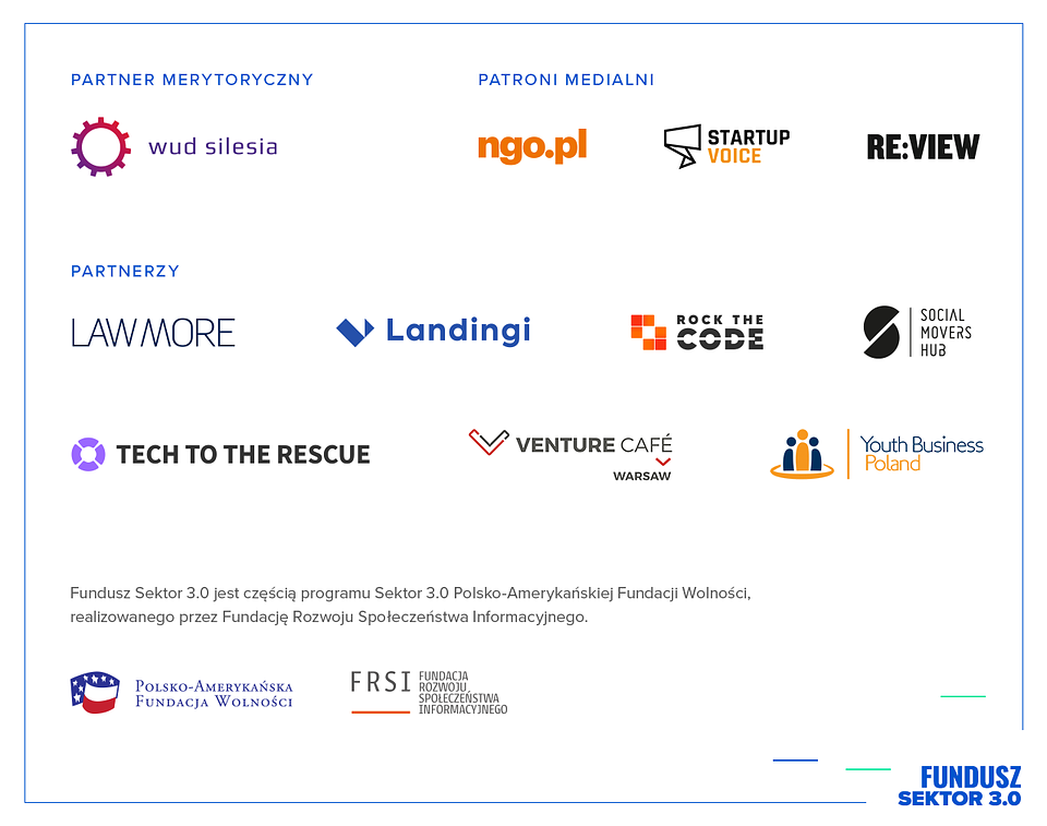 Partnerzy: Landingi, LAWMORE, Rock The Code, Social Movers Hub, Tech To The Rescue, Fundacja Venture Cafe Warsaw, Youth Business Poland
