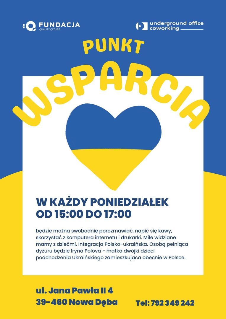 Pomoc dla obywateli Ukrainy otwarcie punktu wsparcia działającego w siedzibie Fundacji Q w Nowej Dębie województwo podkarpackie.