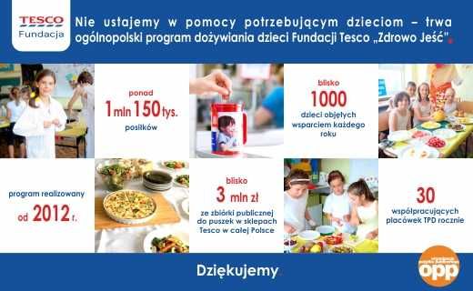 Fundacja Tesco, z pomocą darczyńców, nie przestaje wspierać swoich partnerów, w tym Towarzystwa Przyjaciół Dzieci. Od 2014 roku w ramach partnerstwa strategicznego, które zawiązała z tą jedną z najstarszych organizacji działających na rzecz potrzebujących dzieci, kieruje swoje działania do podopiecznych dziennych placówek opiekuńczo-wychowawczych TPD. Każdego roku placówki biorące udział w programie „Zdrowo jeść” otrzymują od Fundacji Tesco dotację finansową, która jest wykorzystywana na zakup żywności oraz niezbędnego wyposażenia kuchennego, służącego podopiecznym do przygotowywania posiłków.
