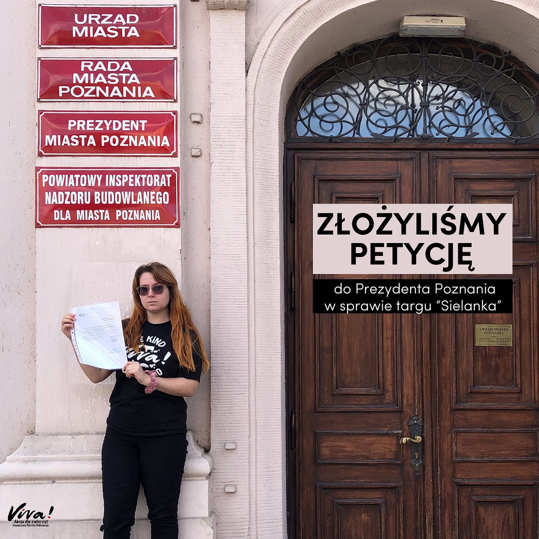 W piątek 1 września wolontariuszki poznańskiego oddziału Vivy złożyły do gabinetu Prezydenta petycję na rzecz zakazu sprzedaży żywych zwierząt na targu „Sielanka” w Poznaniu. Pod petycją podpisało się 5569 osób. Na targu od lat odbywa się kontrowersyjny handel zwierzętami, podczas którego ma miejsce łamanie przepisów prawa, a sytuacja – pomimo wielu doniesień medialnych – nie zmienia się.
