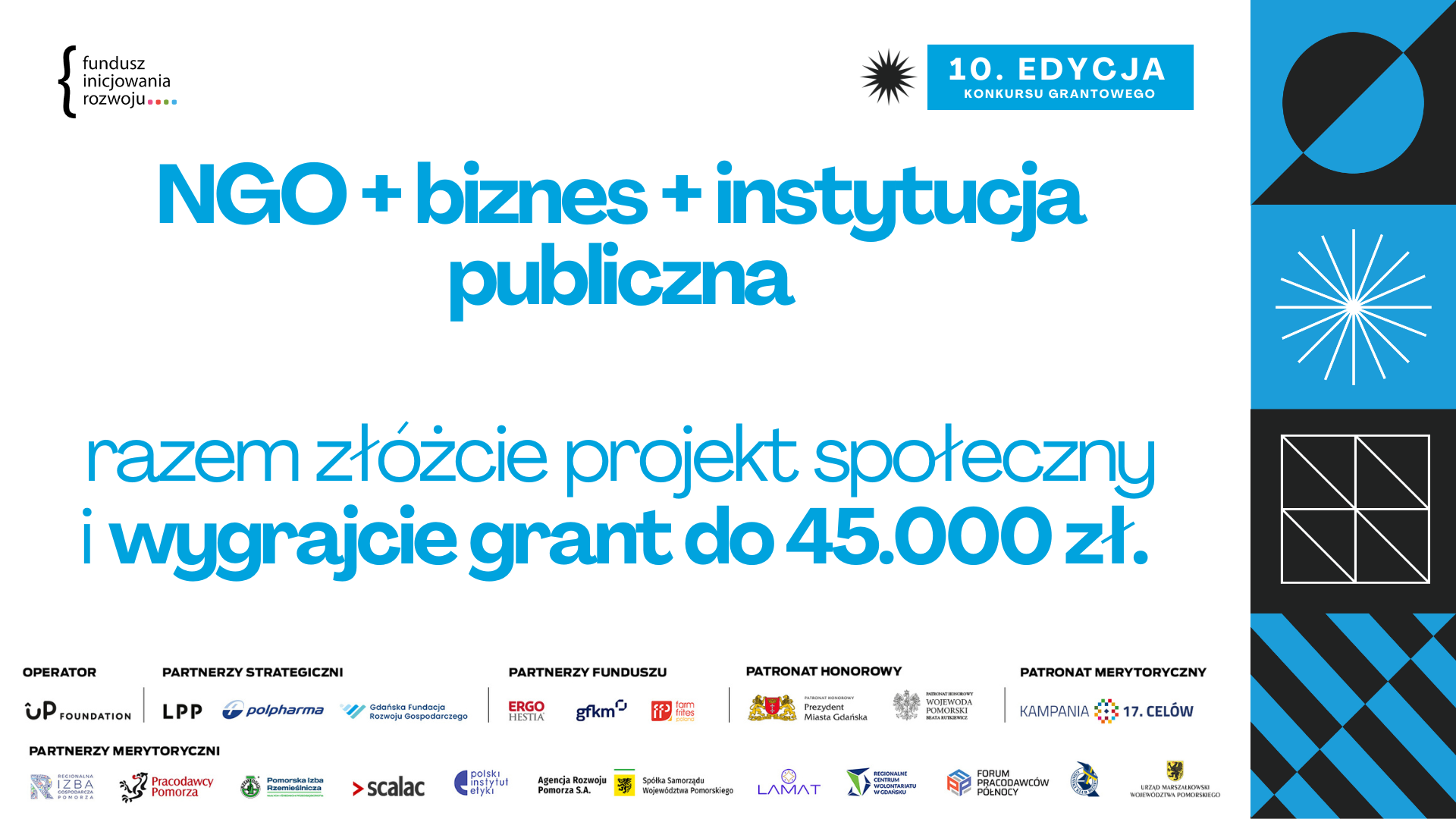 Ważnym elementem wydarzenia będzie Gala jubileuszowej 10. edycji Funduszu Inicjowania Rozwoju – programu grantowego dla organizacji pozarządowych, które w partnerstwie z firmami i instytucjami publicznymi, odpowiadają na aktualne potrzeby społeczne w województwie pomorskim. Do 26 sierpnia 2024 trwa rekrutacja do konkursu, dzięki któremu partnerstwa międzysektorowe mogą otrzymać wsparcie mentorskie i nawet 45 tysięcy złotych. Partnerami Głównymi Konkursu Grantowego są: LPP S.A, Polpharma S.A., Gdańska Fundacja Rozwoju Gospodarczego, zaś Partnerami Farm Frites Poland S.A, ERGO Hestia, Gdańska Fundacja Kształcenia Menedżerów.