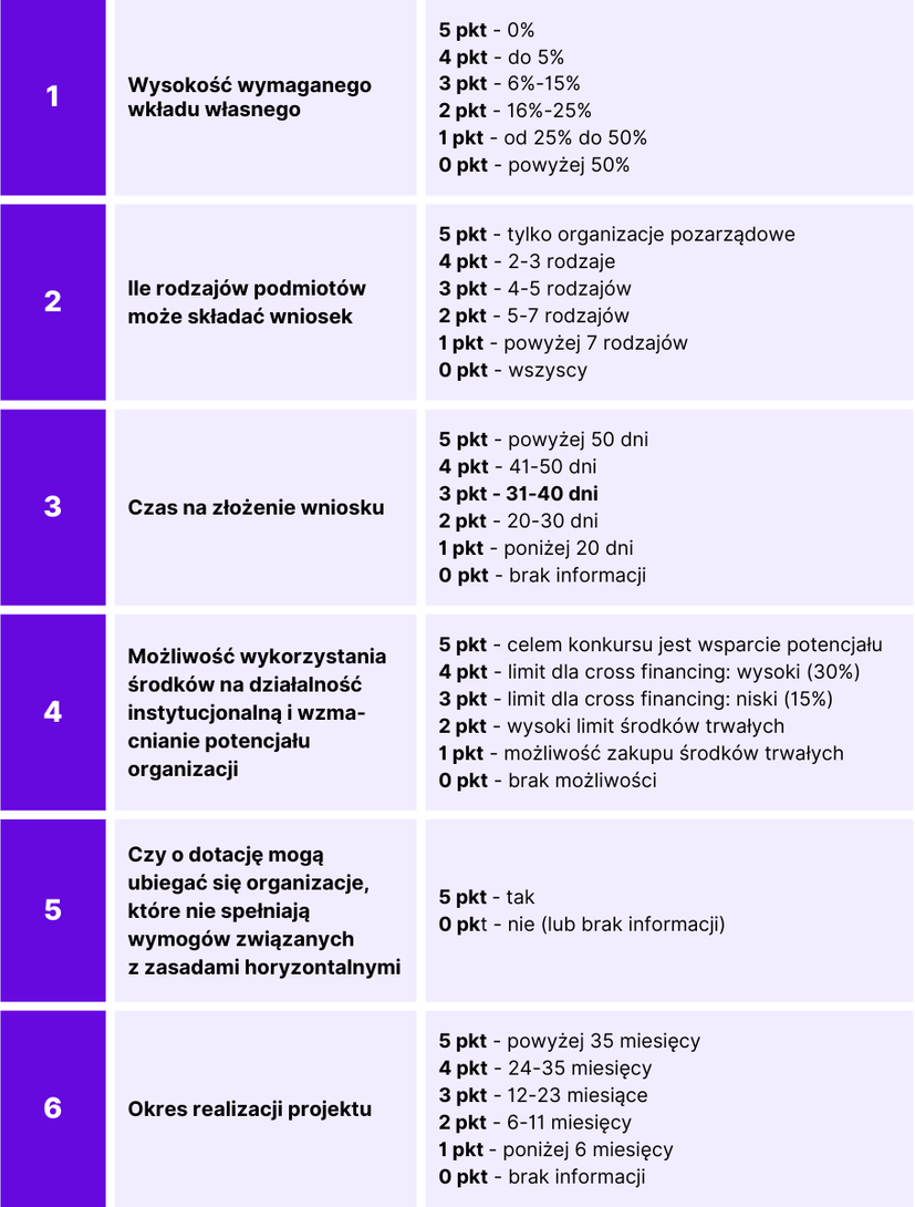 Jednocześnie zauważyliśmy istotne zróżnicowanie w zakresie wymaganych załączników – w części konkursów na etapie składania wniosku o dofinansowanie nie były wymagane żadne załączniki, podczas gdy w innych liczba dokumentów dołączanych do aplikacji była znacząca. Wprowadzenie nowego kryterium ma na celu ujednolicenie podejścia i zapewnienie bardziej obiektywnej oceny publikowanych konkursów.