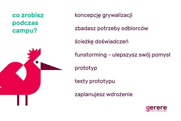 Pozostało zaledwie kilka dni do zamknięcia rekrutacji Gamificiation Campu - darmowego programu inkubacyjnego dla liderów zmian, którzy rozwiązują problemy społeczne oparte na zaangażowaniu. W jego trakcie zaprojektujesz, przetestujesz i zaplanujesz wdrożenie grywalizacji, która podwyższy efektywność Twojej firmy, programu lub projektu.