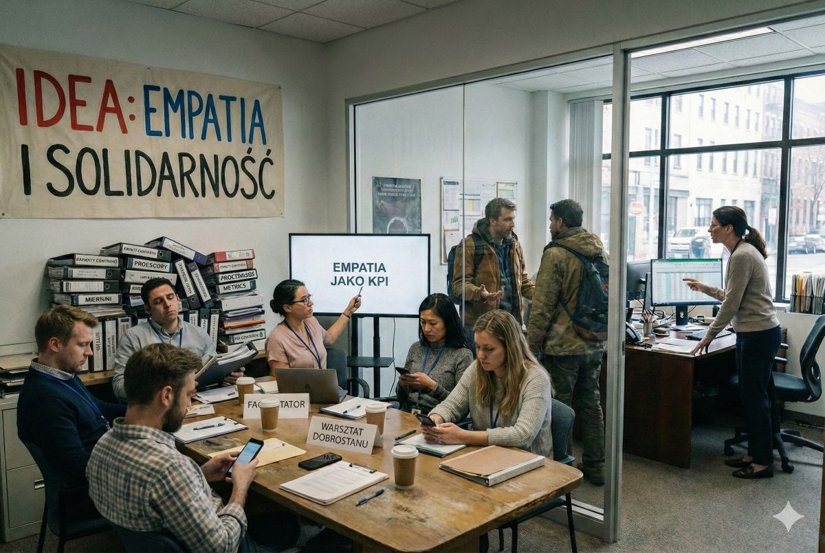 W tym miejscu empatia zaczyna funkcjonować jako hasło projektowe. Staje się kompetencją do wykazania, certyfikatem potrzebnym do kolejnego wniosku grantowego, elementem języka organizacji - ale niekoniecznie jej praktyki. Tymczasem empatia w zespole oznacza realne komplikacje: spowalnia procesy, wymaga rozmów o władzy, granicach, odpowiedzialności i zaufaniu. Tych tematów nie da się zamknąć w harmonogramie ani rozliczyć prostym wskaźnikiem.