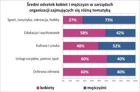 Sfeminizowane są organizacje zajmujące się ochroną zdrowia, pomocą społeczną i edukacją – w ich zarządach przeciętnie na sześć kobiet przypada tylko czterech mężczyzn. Z kolei w opisywanych już organizacjach sportowych na trzy kobiety przypada aż siedmiu mężczyzn, zaś w jednej trzeciej zarządów nie ma ani jednej kobiety.