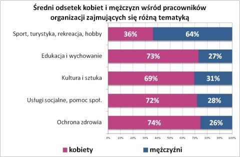 We wszystkich typach organizacji odsetek kobiet wśród pracowników i wolontariuszy jest wyższy niż wśród członków i w zarządach. W stowarzyszeniach sportowych kobiety stanowią średnio nieco ponad jedną trzecią pracowników, natomiast w organizacjach edukacyjnych, socjalnych, ochrony zdrowia i kulturalnych – średnio ponad dwie trzecie. Co ciekawe około jedna trzecia organizacji edukacyjnych i prozdrowotnych nie ma w swoich zarządach żadnego mężczyzny (a tylko co dwudziesta nie ma żadnej kobiety).