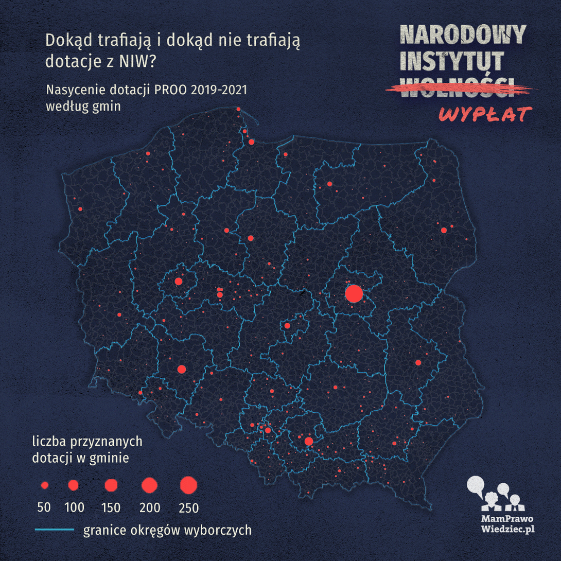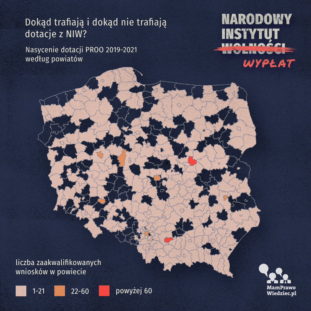 Na mapie przyznanych dotacji dominują organizacje zarejestrowane w miastach na prawach powiatu: Warszawie (242), Krakowie (63), Wrocławiu (53), Poznaniu (43) oraz w powiecie słupeckim (w woj. wielkopolskim) (37). Organizacje w tych powiatach otrzymały łącznie 438 na 1312 przyznanych dotacji.