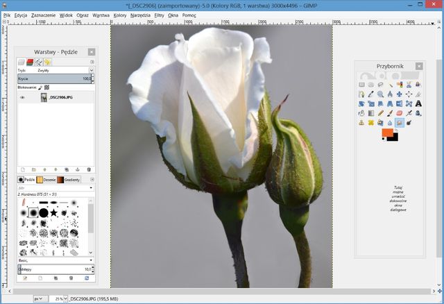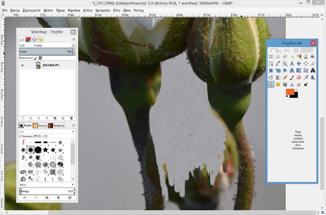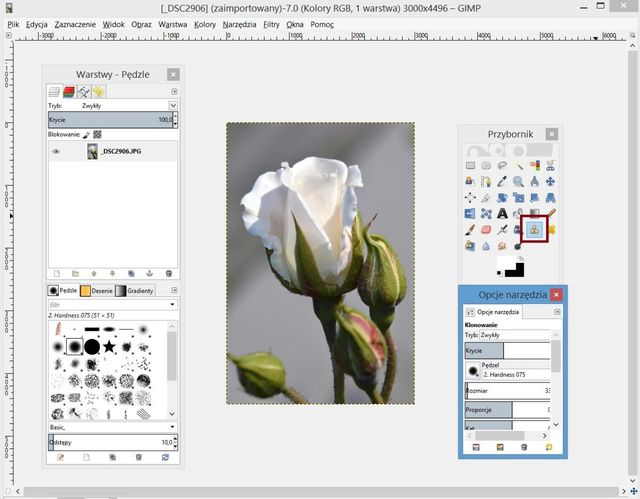 Aby usunąć niepożądany przedmiot na zdjęciu, włączamy stempel (narzędzie „klonowanie”) i dobieramy wielkość oraz rodzaj pędzla, w zależności od obszaru, który chcemy usunąć. Na poniższym przykładzie będą to dwa nieostre pączki.