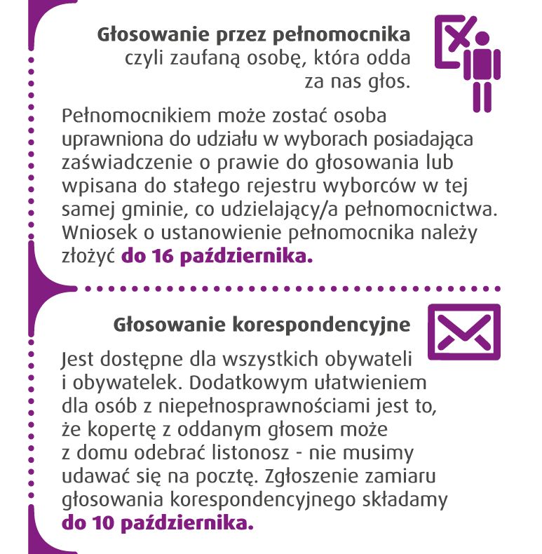 Jednym z nich jest głosowanie korespondencyjne (od tego roku dostępne dla wszystkich wyborców i wyborczyń ). Chęć głosowania korespondencyjnego można zgłosić pisemnie, ustnie lub nawet mailowo w urzędzie gminy (za granicą w konsulacie). Nadanie przesyłki w kraju jest bezpłatne i choć z zasady trzeba ją nadać osobiście na poczcie to osoba z niepełnosprawnością może umówić się na odbiór przesyłki w domu.