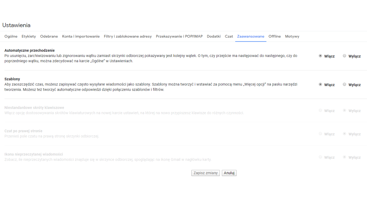 Wszystkie omawiane niżej funkcje są wbudowane domyślnie w Gmail, nie musisz więc korzystać z żadnych dodatkowych wtyczek. Zacznę od dwóch funkcji, które są domyślnie wyłączone. Dostęp do nich znajdziesz na karcie „Zaawansowane” w ustawieniach. Mowa o automatycznym przechodzeniu między e-mailami oraz szablonach wiadomości.