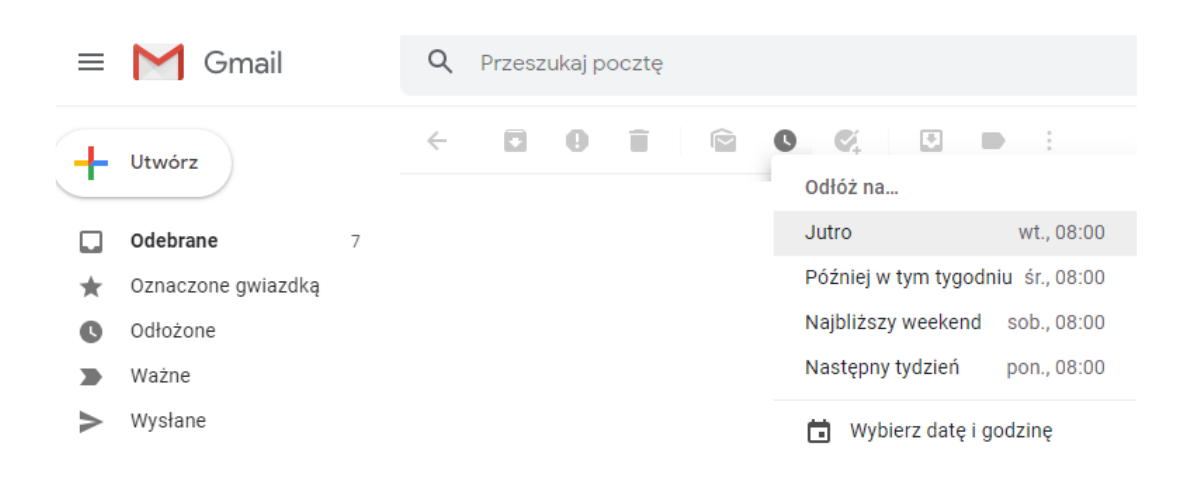 Przy przeglądaniu poczty nie zawsze musisz od razu podejmować decyzje co do wszystkich otrzymanych wiadomości. Wykorzystując funkcję „odłóż na…” masz możliwość ustawienia, kiedy Gmail ma Ci ponownie przypomnieć o konkretnej wiadomości. Zostanie ona przeniesiona z folderu „odebrane” do „odłożone” i pojawi się ponownie w „odebranych” o ustawionej przez Ciebie porze. Możesz używać tej funkcji np. do przypomnień o zapłacie za rachunki.
