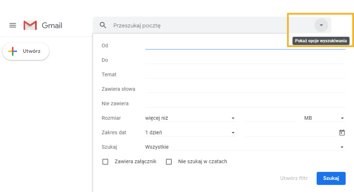 Wyszukiwanie zaawansowane umożliwia dodanie dodatkowych warunków do naszego zapytania w wyszukiwarce wewnętrznej Gmaila. Z jego pomocą możemy szukać np. e-maili z konkretnego okresu lub z załącznikami większymi niż np. 5 MB. Z dodatkowych parametrów można skorzystać na dwa sposoby. Z użyciem operatorów wyszukiwania (możesz np. wpisać w okno wyszukiwania „older_than:4y”, aby wyświetlić wiadomości starsze niż 4 lata) lub przez doprecyzowanie opcji wyszukiwania jak na poniższej ilustracji.