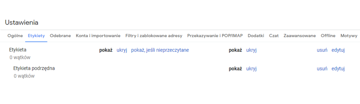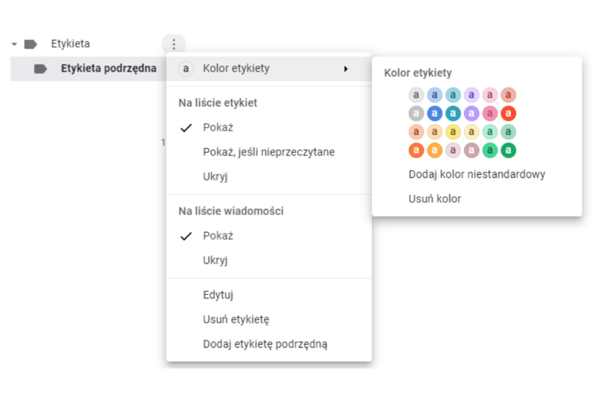 Wykorzystywanie etykiet to świetny sposób, żeby odróżnić i pogrupować wiadomości według własnego klucza. Gmail pozwala na przypisywanie dowolnej liczby etykiet do wiadomości. Do każdej z etykiet możesz przypisać także etykiety podrzędne, dzięki którym jeszcze lepiej określisz kategorię wiadomości.