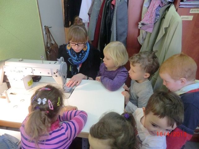 Pierwszym punktem projektu było poznanie zawodu krawcowej. W związku z tym dzieciaki odwiedziły Pracownię Krawiecką „IGIEŁKA” w Lubawie. Zawodowe krawcowe, Pani Kamila i Pani Alina, ciekawie ukazały tajniki zawodu. Opowiedziały na czym polega ta profesja, maluchy wysłuchały również historyjki „Od materiału do sukienki”, czyli dowiedziały się jakie są etapy powstawania stroju. Dzieci z wielkim zainteresowaniem oglądały atrybuty krawieckie, m. in. miarę krawiecką, nożyce do cięcia materiału, nożyczki do obcinania nitek, nitki, zamki, guziki. Dużym zainteresowaniem cieszyły się maszyny do szycia, których w Pracowni Krawieckiej było nie mało. Dzieciaki na overlocku obszywały skrawki materiału, zaś na maszynie komputerowej samodzielnie wyszywały imiona na ręcznikach, które przedszkolaki dostały w prezencie od Pań krawcowych.
