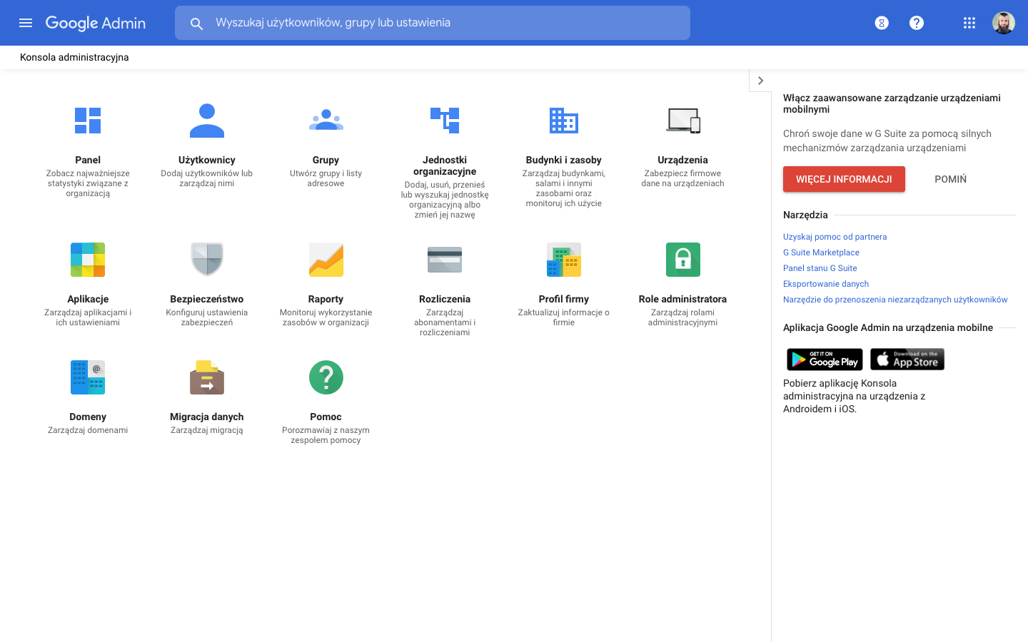 Przede wszystkim, G Suite umożliwia organizacji korzystanie z własnej domeny. Dzięki temu w Gmailu obsłużymy własne adresy mailowe (np. michał@nazwastowarzyszenia.org.pl) zamiast darmowych adresów @gmail.com. Daje też więcej funkcji (jak np. 30 GB na dane dla każdego użytkownika w ramach organizacji) oraz możliwość łatwego zarządzania zasobami organizacji z poziomu Konsoli Administratora.