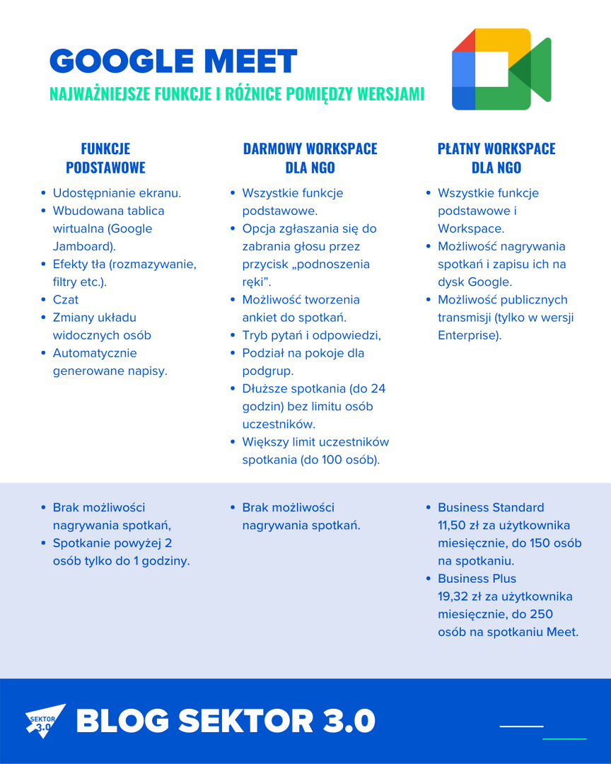 Pełne zestawienie funkcji w każdej z opcji bezpłatnych i płatnych Google Meet znajdziesz na tej stronie.