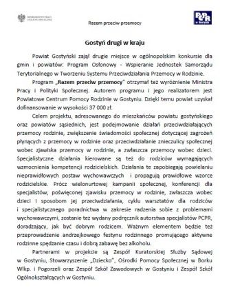 Powiat Gostyński zajął drugie miejsce w ogólnopolskim konkursie dla gmin i powiatów: Program Osłonowy - Wspieranie Jednostek Samorządu Terytorialnego w Tworzeniu Systemu Przeciwdziałania Przemocy w Rodzinie.