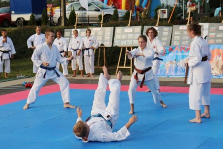 Reprezentanci klubu karate shotokan (mistrzowie karate: Mieczysław Polewski – 4. Dan, Mirosław Sobkowiak – 4. Dan, Marcin Danek – 2. Dan, oraz uczniowie: Daria Pietrzyk – 3. Kyu, Patrycja Niewrzędowska – 3. Kyu, Amelia Ziółek – 4. Kyu, Agnieszka Leciej – 5. Kyu, Dawid Mila – 4. Kyu, Wojciech Wietrzny – 4. Kyu i Dawid Mrowiński – 4. Kyu,) pokazali elementy treningu karate: elementy kihonu, czyli wielokrotnego powtarzania bloków, uderzeń i kopnięć, elementy kumite, czyli walki sportowej, prowadzonej z pełną kontrolą uderzeń, elementy samoobrony z wykorzystaniem dźwigni i rzutów, oraz kata, czyli układów technik wykorzystywanych w walce z kilkoma przeciwnikami, po wykorzystanie bloków, przechwytów i podcięć, w tym przed atakiem kijem i innymi niebezpiecznymi narzędziami, np. nożem. Na koniec zaprezentowano pokaz odporności na ból i uderzenia. Karatecy łamali na swoich partnerach deski. Do tego dodali zaprezentowanie tameshi waza, czyli element treningu mistrzów polegający na łamaniu twardych przedmiotów przy pomocy np. techniki shuto, czyli uderzenia kantem dłoni czy haito uchi – uderzenie przedramieniem.