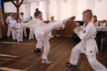 Tym razem jednak zajęcia odbywały się w obecności rodziców, którzy przyglądali się trenującym i zapoznawali się z różnymi formami zajęć treningowych. Młodzi adepci karate pod okiem mistrzów ćwiczyli kihon, kumite oraz kata. W czasie zgrupowania karatecy trenowali i pokazali wszystkie podstawowe elementy treningu. Doskonalono poszczególne bloki, zasłony, uderzenia, kopnięcia, podcięcia oraz rzuty w kihon, czyli formie treningowej polegającej na wielokrotnym powtarzaniu technik i ich kombinacji. Kolejnym etapem zgrupowania był trening kata, czyli sekwencji technik ataku i obrony w walce z kilkoma przeciwnikami. Ważną częścią zgrupowania było kumite, czyli walka. Ta forma treningu wymaga od karateków dużego skupienia, wyczucia dystansu i ruchów przeciwnika oraz zachowania pełnej kontroli stosowanych bloków, uderzeń, kopnięć, podcięć, dźwigni i rzutów.