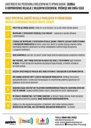 W czasie dyskusji i wymiany poglądów na grupie wsparcia uczestnicy podkreślali, że to nie media cyfrowe same w sobie są złe i niebezpieczne, takie natomiast może być nasze ich używanie. Dlatego warto pamiętać, że ograniczenie dostępu do mediów cyfrowych, w tym urządzeń mobilnych, jest jednym z wielu działań możliwych do zastosowania. A w uczeniu korzystania ze smartfona skuteczniejsze są ustalone odpowiednio wcześnie i przestrzegane zasady niż stosowanie kar i zakazów.