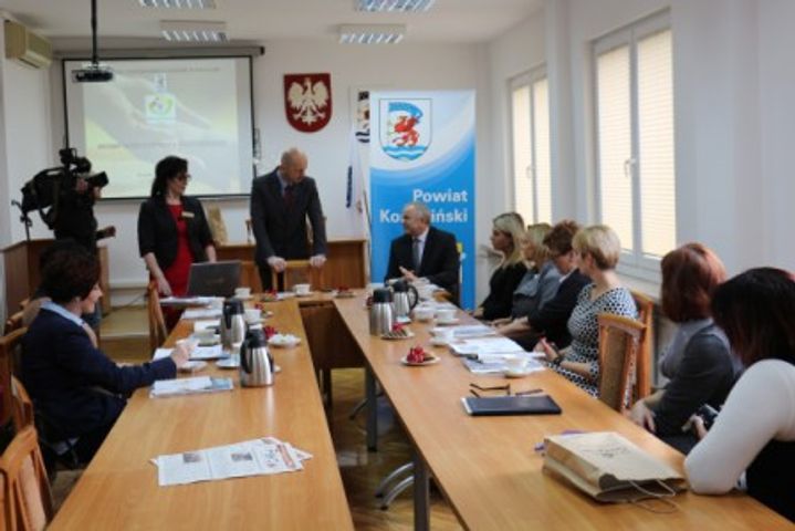 Wizytę rozpoczęło spotkanie gości w Starostwie Powiatowym w Koszalinie z Dariuszem Kalinowskim Wicestarostą Powiatu Koszalińskiego i Mirosławą Zielony Dyrektorem Powiatowego Centrum Pomocy Rodzinie w Koszalinie oraz przedstawicielkami kadry kierowniczej PCPR w Koszalinie. W trakcie wspólnych obrad goście z Powiatu Gostyńskiego zapoznali się z systemem pomocy społecznej Powiatu Koszalińskiego. W tym systemie, koordynowanym przez Powiatowe Centrum Pomocy Rodzinie w Koszalinie, działa 97 rodzin zastępczych, prowadzone są działania przeciw przemocy w rodzinie, działa Punkt Ośrodka Pomocy dla Osób Pokrzywdzonych Przestępstwem, prowadzona jest pomoc dla osób niepełnosprawnych, realizowanych jest przez PCPR wiele projektów socjalnych, programów i pilotaży. Działają instytucje: Domy Pomocy Społecznej dla osób przewlekle somatycznie chorych: w Cetuniu, w Mielnie, w Parsowie; Dom Pomocy Społecznej dla osób przewlekle psychicznie chorych w Żydowie, Domy Pomocy Społecznej dla osób dorosłych oraz dla dzieci i młodzieży niepełnosprawnej intelektualnie: w Nowych Bielicach i w Bobolicach. Ten ostatni prowadzony jest przez Siostry Pallotynki.