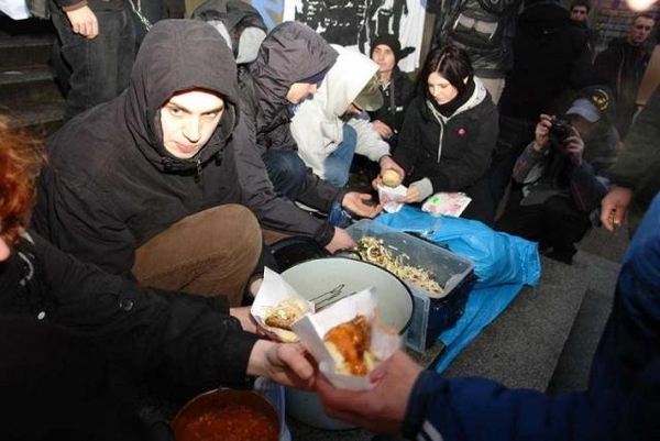 A garnki, naczynia i sprzęt do gotowania? „Na początku było tak, że każdy to, co mógł przynosił z domu. Wiele garnków dostaliśmy od ludzi, którzy po prostu przynieśli je na Rozbrat. Ja na przykład przyniosłem widelec”- żartuje Bastek. „Kiedyś sporo naczyń dostaliśmy od pewnego księdza, który pomagał bezdomnym i w momencie, gdy przestał to robić, oddał wszystko nam.”