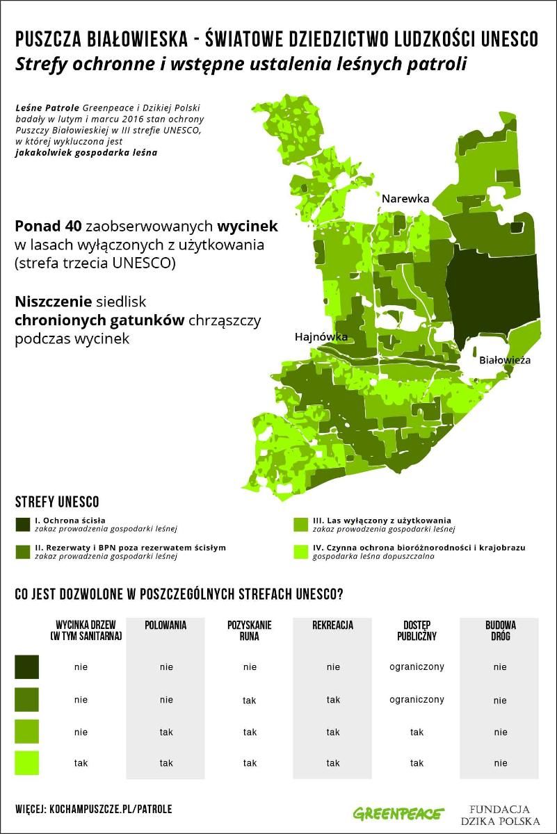 O tym, że obawy te są uzasadnione, zaświadczają dane zebrane przez Leśne Patrole Greenpeace i Fundacji Dzika Polska. Patrole zidentyfikowały tereny, na których prowadzone wycinki naruszyły siedliska chronionych przez Unię Europejską chrząszczy - ponurka Schneidera i zgniotka cynobrowego. Jednocześnie patrole zidentyfikowały ponad 40 obszarów, gdzie przez ostatnie półtora roku prowadzono wycinkę w trzeciej strefie ochronnej, która zgodnie ze zobowiązaniami wobec UNESCO miała był wyłączona z użytkowania leśnego, w tym tzw. cięć sanitarnych (patrz mapka).