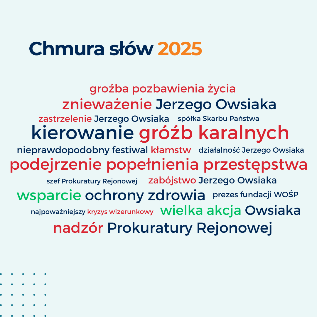 Z zestawienia wynika, że jeszcze rok temu wzmianki dotyczące Owsiaka oraz jego działalność związanej z WOŚP pojawiały się w mediach w raczej neutralnym bądź pozytywnym kontekście. W styczniu 2025 roku obserwuje się natomiast wyraźny wzrost określeń, które ujawniają wartościowanie negatywne – wiążą się one bowiem z groźbami śmierci skierowanymi wobec szefa WOŚP, znieważeniem czy podejrzeniami popełnienia przestępstwa.