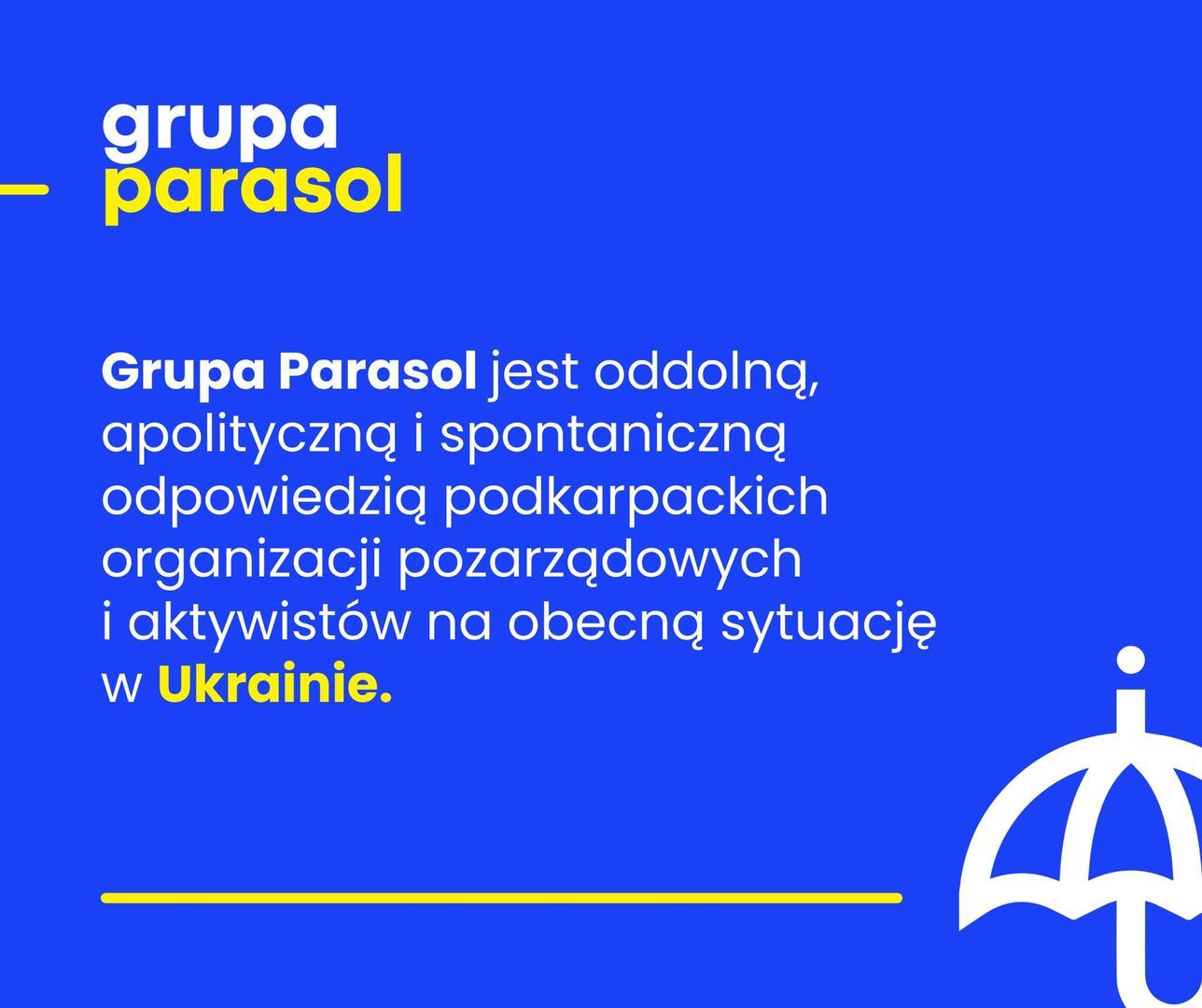 Grupa Parasol jest oddolną, apolityczną i spontaniczną odpowiedzią podkarpackich organizacji pozarządowych i aktywistów na obecną sytuację w Ukrainie. Niesiemy wszechstronną pomoc poszkodowanym i potrzebującym Uchodźcom oraz organizacjom działającym na ich rzecz. Działamy w całym województwie podkarpackim. Koordynujemy działania, które powstały z potrzeby serca, są niezwykle istotne, a przy tym muszą być profesjonalne, aby pomoc docierała szybko i skutecznie.