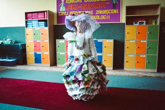 Opis: Rozważna i romantyczna” - Dama XXI wieku może być romantyczna, ale musi być również rozważna i mieć na uwadze dobro środowiska naturalnego. W obecnych czasach, wobec rosnącej w zastraszającym tempie ilości produkowanych śmieci, rozwagą jest segregowanie odpadków i szukanie sposobów na powtórne ich wykorzystanie. Do zaprojektowania stroju użyto materiałów papierowych, tekstylnych oraz tworzywa sztucznego. Dzięki starym gazetom, folii, bibule , papierowi toaletowemu, opakowaniach po jajkach, żelu pod prysznic, starej koronce i innym niepotrzebnym przedmiotom, które „lądują” w koszu lub poniewierają się po domu, udało się stworzyć strój, w którym chyba każda mloda dama chętnie poszłaby na bal lub romantyczny spacer.