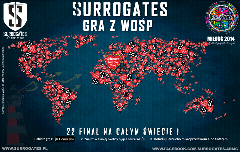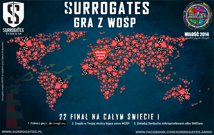 Ciekawie do organizacji gry miejskiej podeszła Wielka Orkiestra Świątecznej Pomocy w 2014 r. opierając ją na mechanizmie geolokalizacji, czyli lokalizowaniu danych przedmiotów lub miejsc za pomocą systemu GPS. Powstała w ramach większej aplikacji Surrogates (program ten dostępny był tylko na Androidzie). Wchodząc do gry widzimy siebie na mapie. Aplikacja automatycznie wyrzucała wokół nas kilkanaście, kilkadziesiąt serduszek, były one checkpointami. Jeżeli kliknęliśmy na któreś z serduszek pojawiała się możliwość wpłaty, mikro-przelewem lub przez SMS. Po tym, jak wsparliśmy Orkiestrę i zaliczyliśmy checkpoint, pojawiało się serce, które mogliśmy wrzucić na tablicę na portalu społecznościowym. Dzięki takiemu rozwiązaniu, można było wesprzeć WOŚP z każdego zakątka świata. Po zakończeniu gry została stworzona mapa z miejscami, gdzie zostały dokonane wpłaty i zdobyte checkpointy.