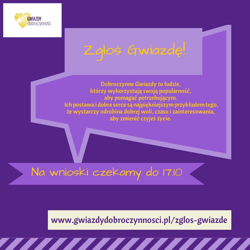 Współpracujesz z Gwiazdą, która wspiera Twoją działalność dobroczynną, jest twarzą kampanii społecznej, wolontariuszem, fundatorem? Jeszcze do 17 października możesz ją zgłosić do Plebiscytu "Gwiazdy Dobroczynności" na www.gwiazdydobroczynnosci.pl/zglos-gwiazde