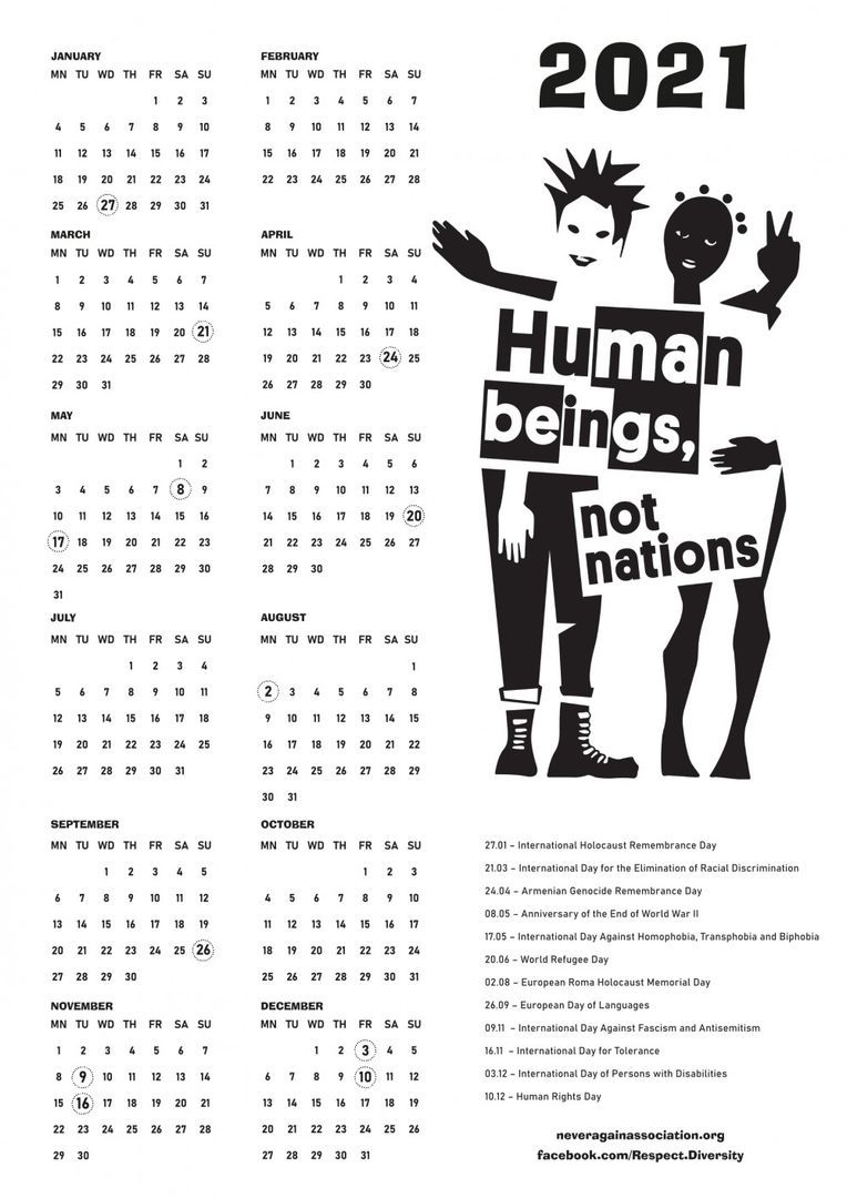 We’d like to recommend the 2021 wall calendar titled “Human beings, not nations” designed by the “NEVER AGAIN” Association. In it we marked the most important dates related to celebrating human rights, as well as a selection of historic anniversaries.