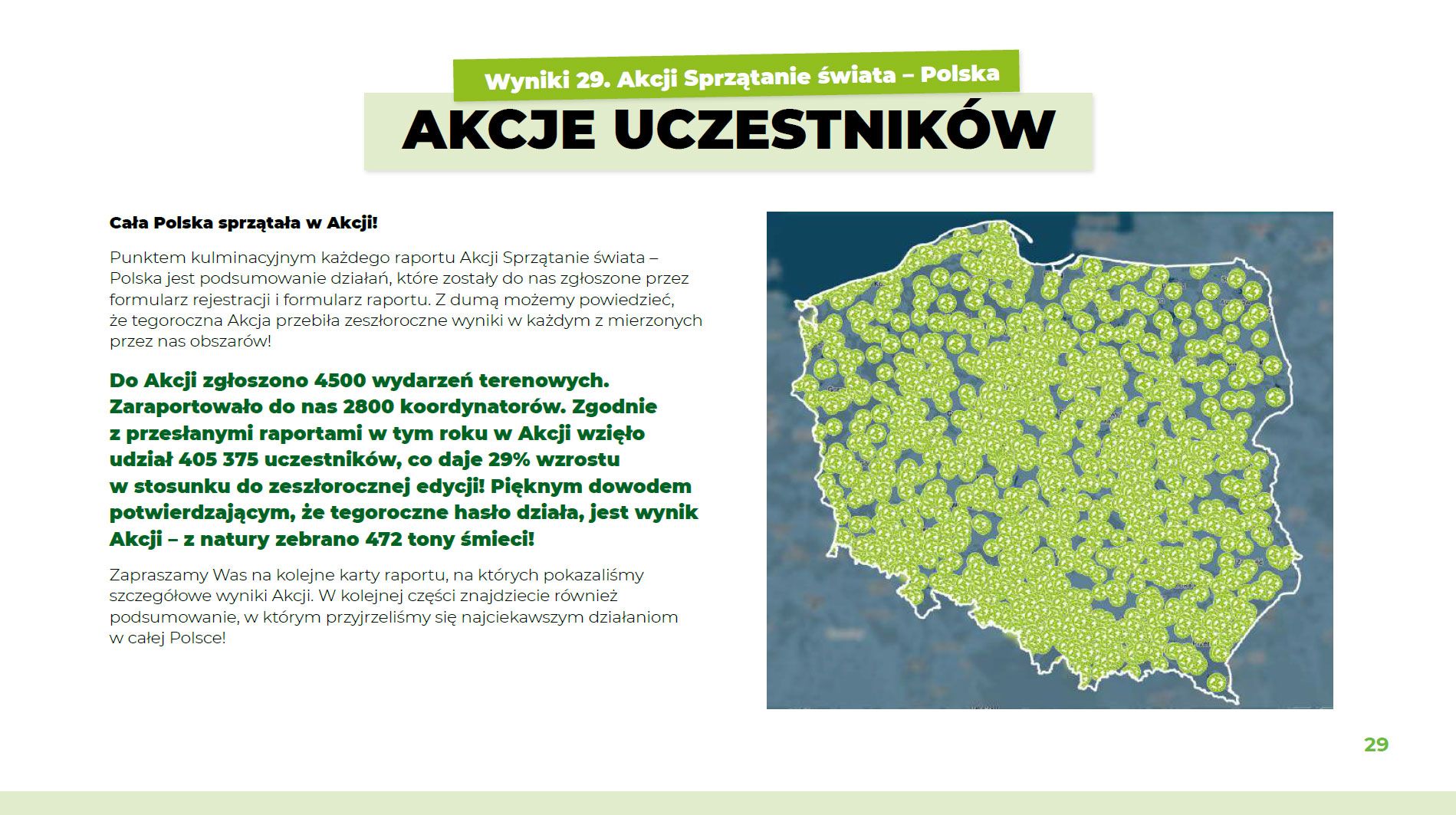 W raporcie, który jest co roku przygotowywany przez Fundację Nasza Ziemia na podstawie sprawozdań uczestników danej edycji, zostały podsumowane wszystkieprzeprowadzone i zgłoszone sprzątania. To jedyna taka publikacja w Polsce, która od 30 lat rzuca światło na to, jak dużym problemem jest śmiecenie w naturze.
