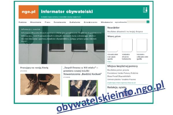 Ruszył nowy serwis w portalu ngo.pl - Informator Obywatelski. Jest serwisem edukacyjno-poradniczym. Znajdziesz tu podstawowe informacje o swoich uprawnieniach w różnych obszarach życia codziennego: o sprawach mieszkaniowych, rodzinnych, o zadłużeniach, zatrudnieniu, emeryturach, prawie spadkowym, pomocy społecznej. Możesz również skorzystać z pomocy doradców obywatelskich, zadając pytanie przez internet.
