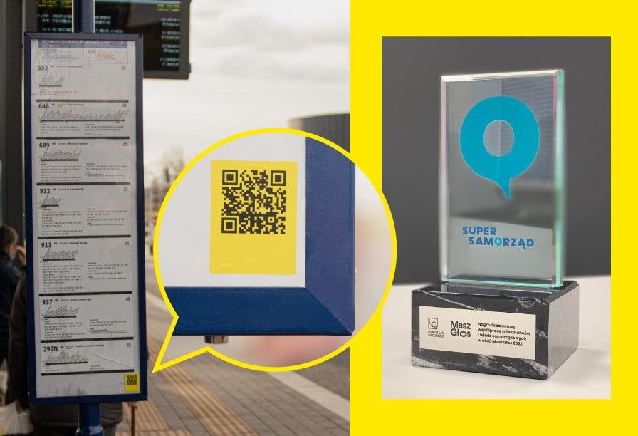 Po lewej stronie zdjęcia tablica z rozkładami jazdy z żółtą naklejką, na której widnieje nazwa przystanku zapisana w alfabecie Brailla oraz kod QR, który odsyła do strony z rozkładami jazdy. Po prawej stronie statuetka, którą otrzymał Zarząd Transportu Metropolitalnego m.in. za wdrożenie wielu rozwiązań dedykowanych osobom z niepełnosprawnościami.