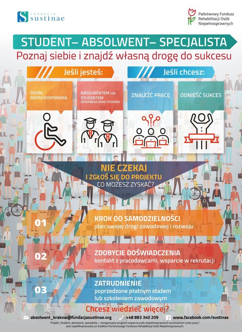 Jeśli chcesz dołączyć do projektu zapraszamy do kontaktu z biurem Fundacji w Krakowie:[email protected], tel. +48 883 340 209., lub w Warszawie: [email protected], tel. +48 883 340 212. Szczegółowe informacje o projekcie oraz regulamin projektu dostępne są na stronie Fundacji: www.fundacjasustinae.org . Projekt „Student, absolwent, specjalista - projektu „Student, absolwent, specjalista – zintegrowany program wsparcia osób niepełnosprawnych na otwartym rynku pracy” otrzymał dofinansowanie ze środków PFRON, w ramach pilotażowego programu „Absolwent”.
