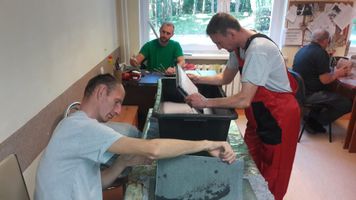 Uczą się nie tylko podopieczni fundacji, ale i pracownicy. Ich 10-osobowa grupa przebywa właśnie w Margaux we Francji na szkoleniu z papiernictwa i introligatorstwa. Pojechali tam w ramach programu ERASMUS+, projekt w jakim biorą udział nazywa się „Zróbmy pierwszy krok!”. W manufakturze Ruscombe Paper Mill u mistrza Frederica uczą się nie tylko czerpania papieru, ale też jego zdobienia metodą Suminagashi. Wcześniej byli na kursie ceramiki.