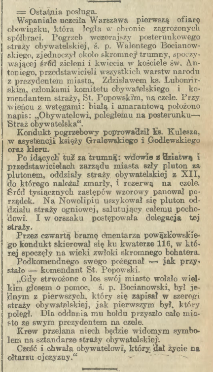W porannym wydaniu Kurjera czytamy, jak to zarząd Warszawy przejmuje kolejne zadania, którymi do tej pory zajmowali się zorganizowani obywatele: „Sprawy sanitarne. Zamiast b. komitetu sanitarnego przy magistracie utworzyła się służba zdrowia w mieście i na przedmieściach. Organami tej służby są: sekcja sanitarno-lekarska, komisja wykonawcza czyli urząd zdrowia, inspektor sanitarny, cyrkułowe opieki sanitarne obywatelskie, lekarze sanitarni, asesor farmacji, asesor weterynarji i niższa służba sanitarna. Na wczorajszem posiedzeniu opracowano pierwszy budżet służby zdrowia oraz zatwierdzono instrukcje. Utrzymanie służby zdrowia ma wynosić 35,185 rbl. miesięcznie. Pieniędzy na utrzymanie tej służby ma dostarczyć komitet obywatelski. Budżet powyższy nie obejmuje szpitali dla chorych zakaźnych, przytułków dla zbiegów itd”.