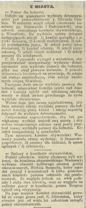 Kurjer Warszawski w dodatku porannym podaje: „Inspektorjat fabryczny. Na posiedzeniu komitetu obywatelskiego p. E. Potempski wystąpił z wnioskiem zorganizowania inspektorjatu fabrycznego, składającego się z jednego inspektora fabrycznego i 6 inspektorów dzielnicowych. Komitet uchwalił utworzyć specjalną komisję i powołać do niej: członków komitetu pp. E. Potempskiego i L. Krzywickiego, delegata z sekcji prawnej, delegata z sekcji rzemieślniczej i delegata z Tow. przemysłowców i Stow. techników. Komisja opracuje projekt i przedstawi go komitetowi do zatwierdzenia”.