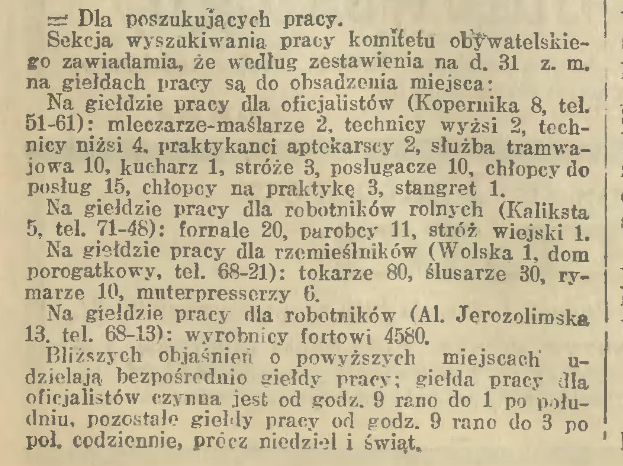 W numerze Kurjera Warszawskiego czytamy m.in. o działaniach Sekcji wyszukiwania pracy Komitetu Obywatelskiego. Jak wynika z ogłoszeń potrzebni byli m.in. mleczarze-maślarze czy muterpresserzy(!?).