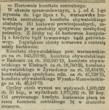 W dodatku porannym Kuriera Warszawskiego czytamy zaś o hurtowniach komitetu centralnego. Oto „W okresie sprawozdawczym, t. j. od d. 1-go stycznia do 1-go lipca r. b., warszawska hurtownia centralnego komitetu obywatelskiego obsłużyła 151 hurtowni prowincjonalnych, zaopatrując je w produkty spożywcze niezbędnej potrzeby”