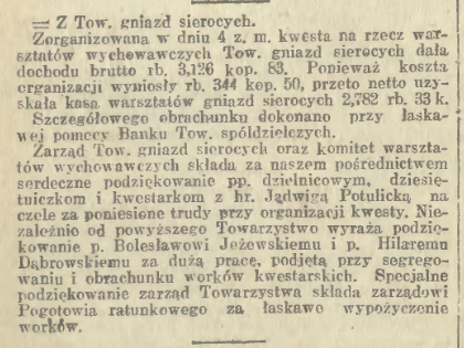 W innym zaś miejscu „Internat dla kobiet. Utratę ognisk domowych pragnie łagodzić nasze chrześcijańskie Tow. ochrony kobiet, otwierając domy, schroniska, internaty dla uczciwych kobiet pracujących w różnych dzielnicach miasta. Obecnie oddział ochrony kobiet w parafji Wszystkich Świętych otwiera internat dla dziewcząt i kobiet młodych, z pierwszeństwem dla pracownic fabryk i zakładów miejscowych. Za skromną opłatę znajdą one tam wspólne mieszkanie umeblowane, schludne, słoneczne, posiłek ranny i wieczorny, a jednocześnie radę, opiekę pomoc siostrzaną ze strony opiekunek. Zgłoszenia osób, pragnących znaleźć pomieszczenie w internacie, który nosić będzie nazwę „Domu św. Emilji", przyjmowane są codziennie (…) przy ul. Srebrnej No 2, m. 6”.