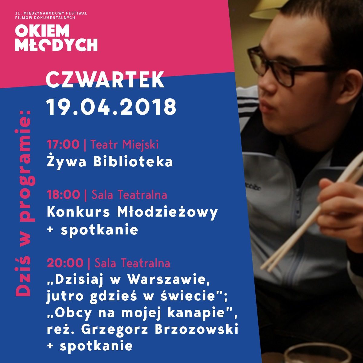 Dzień zakończymy pokazem dwóch obrazów wyreżyserowanych przez Grzegorza Brzozowskiego: „Obcy na mojej kanapie” oraz „Dzisiaj w Warszawie, jutro gdzieś w świecie”, z którym autor pojawił się w Konkursie Głównym „Okiem Młodych” w 2012 r.