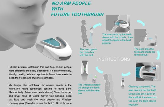 No-arm toothbrush to, zgodnie z nazwą, urządzenie pozwalające samodzielnie czyścić zęby osobom z niepełnosprawnością górnych kończyn. Urządzenie przypominałoby swoją formą ochraniacz na zęby. Byłoby ono umocowane na ścianie w swoistej stacji dokującej. Po jego aktywowaniu uruchamiany byłby ciąg obrotowych szczotek, które równocześnie czyściłyby wszystkie zęby użytkownika. Po zakończonym myciu zębów, urządzenie byłoby automatycznie płukane w płynie antybakteryjnym, umieszczonym wewnątrz stacji dokującej. Całość miałaby być zasilana bezprzewodowo, aby uniknąć ewentualnego kontaktu ładowarki z wodą.