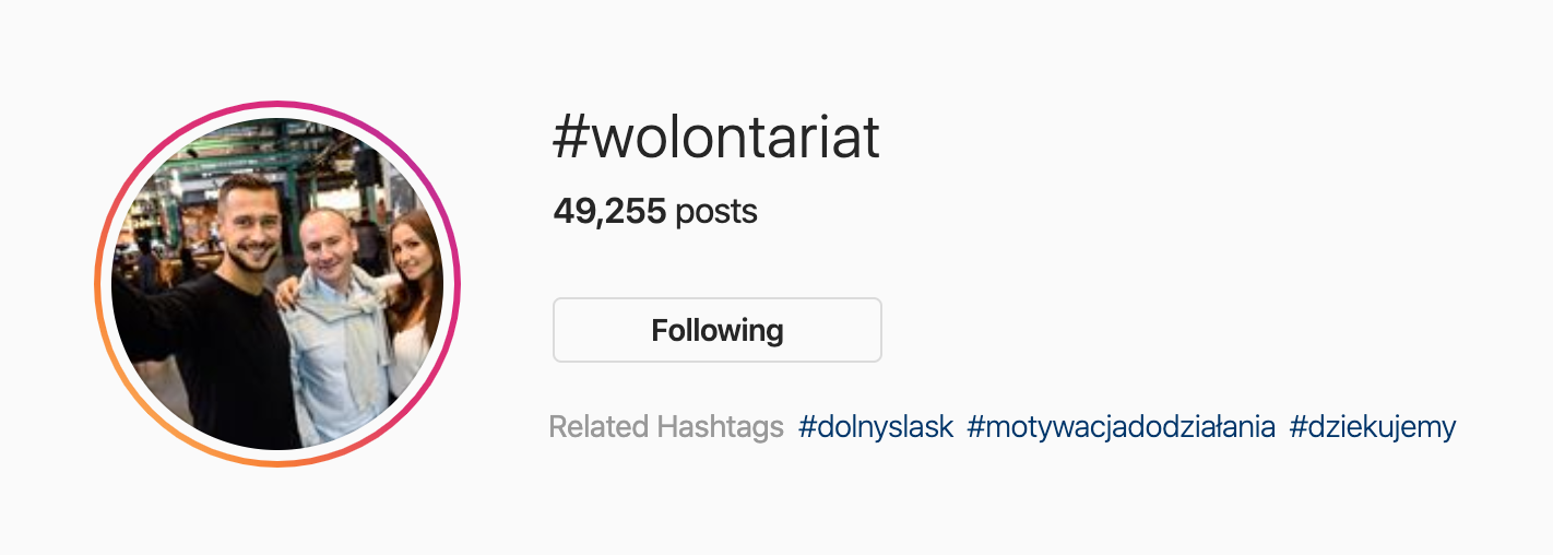 PROTIP: Kiedy wpiszesz w wyszukiwarkę np. #wolontariat, Instagram podpowiada Ci hashtagi powiązane, czyli takie, które najczęściej stosowane są przez użytkowników wraz z #wolontariat – może być to podpowiedź i inspiracja do tego, jakie hashtagi stosować w komunikacji. [zdjęć wolontariat]Czytaj więcej o hashtagach: Czy wiesz, jak wykorzystać # w NGO?