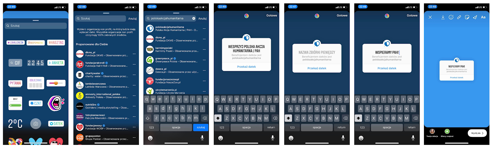 Przycisk „Datek” możesz dodać jako naklejkę w Instagram Stories i zachęcić swoich followersów do wpłacania środków na działania Twojej organizacji lub konkretny cel. Proces przekazywania darowizny wygląda następująco: