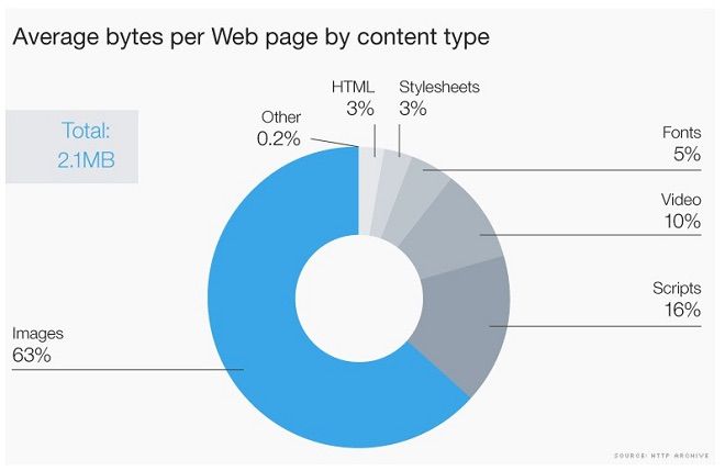 Obrazy i materiały wideo stanowią dzisiaj - w uśrednieniu - aż 75% objętości strony. Co ciekawe, pomimo zwiększającego się całościowego rozmiaru witryn, te dane pozostają niezmienne. Z czego to wynika? Z potrzeby dostosowania stron do urządzeń mobilnych, oczywiście!