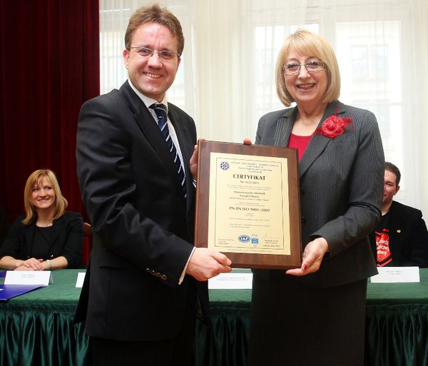 – Do niedawna mówiło się, że normy ISO-9001 mają zastosowanie tylko w sferze produkcyjnej. Państwo są przykładem na to, że standard ten sprawdza się również w obszarze usług publicznych - powiedział Artur Szwoch, wiceprezes Polskiej Izby Handlu Zagranicznego Certyfikacja sp. z o.o. wręczając certyfikat ISO-9001 przewodniczącej Zarządu Głównego Stowarzyszenia MONAR. Uroczystość odbyła się 12 kwietnia, podczas konferencji prasowej w Warszawie.