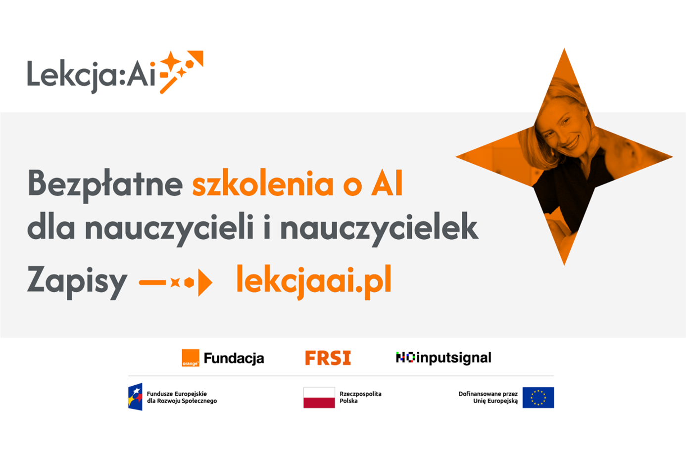 Projekt Lekcja:AI dofinansowano ze środków unijnych w ramach programu FERS kwotą 11040819,90 zł (w konkursie Ministerstwa Edukacji Narodowej). Fundacja Orange ma już doświadczenie w prowadzeniu inicjatyw na dużą skalę. Od 20 lat działa w obszarze edukacji i bezpieczeństwa w internecie. W jej inicjatywach wzięło udział prawie 650 tys. dzieci, a w szkoleniach z kompetencji cyfrowych 93 tys. nauczycieli_ek (m.in. w projekcie „Lekcja:Enter”). Od 2022 r. prowadziła także kurs #BurzaMózgów o sztucznej inteligencji. Jej działania są elementem społecznego zaangażowania Orange.